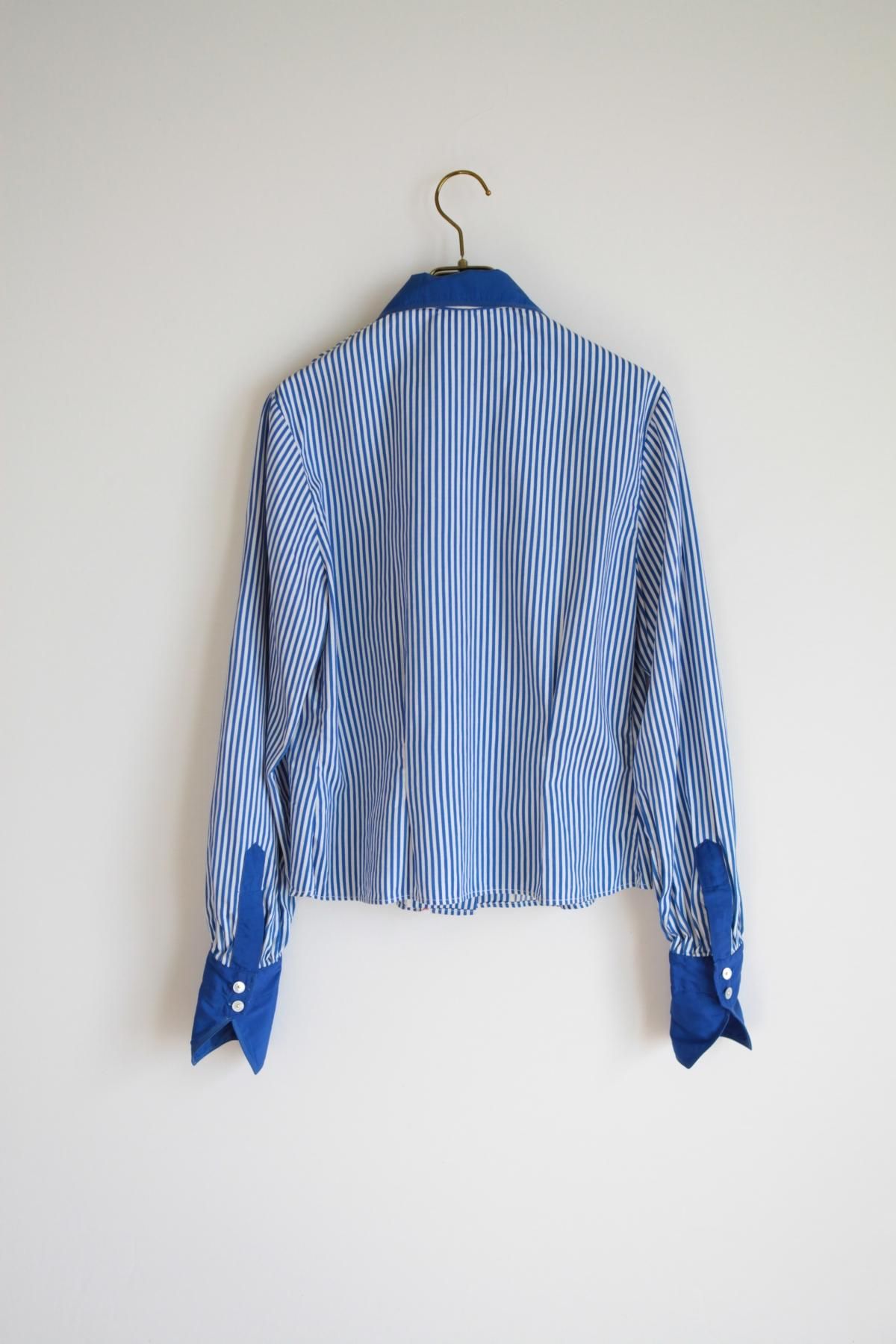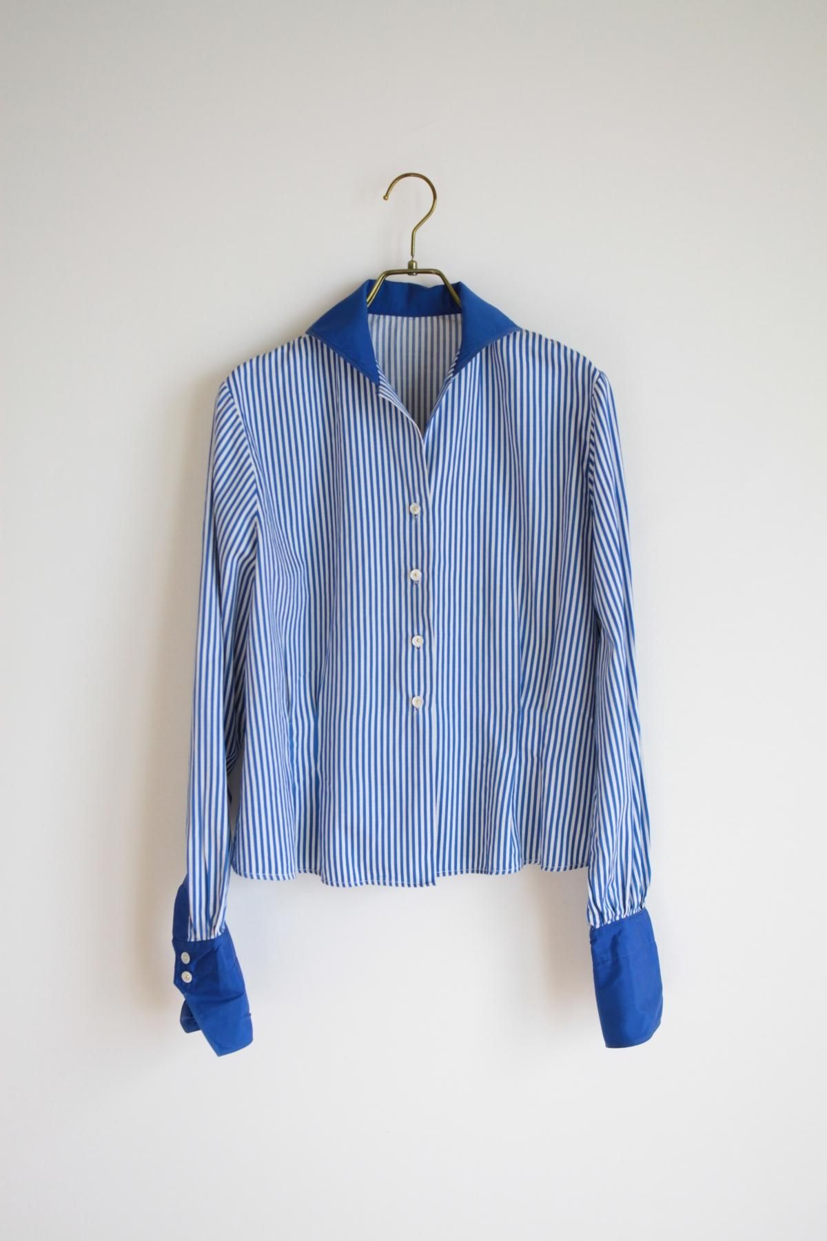 ブルーストライプと袖口がポイント襟元、袖口にある細かいステッチが美しい